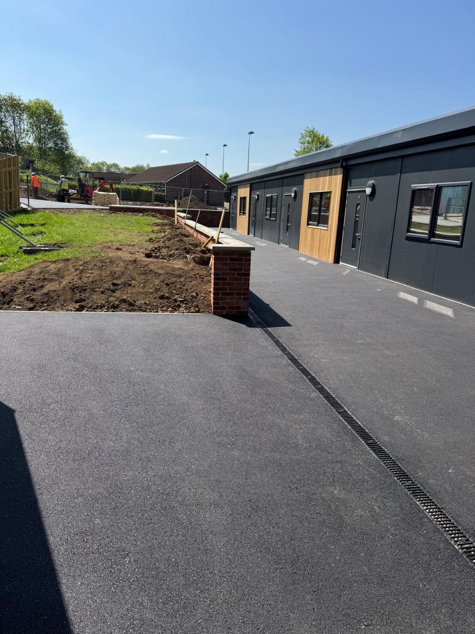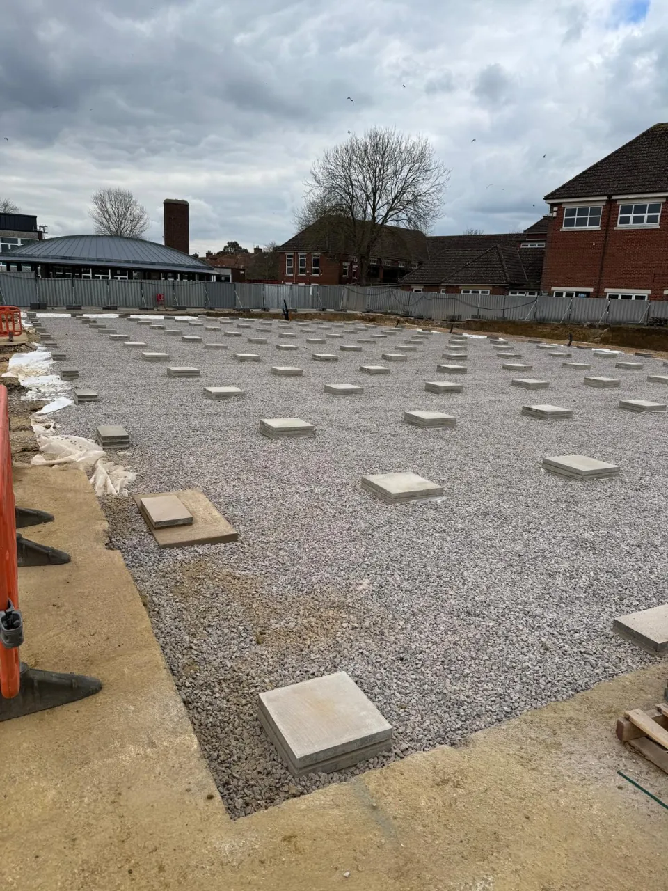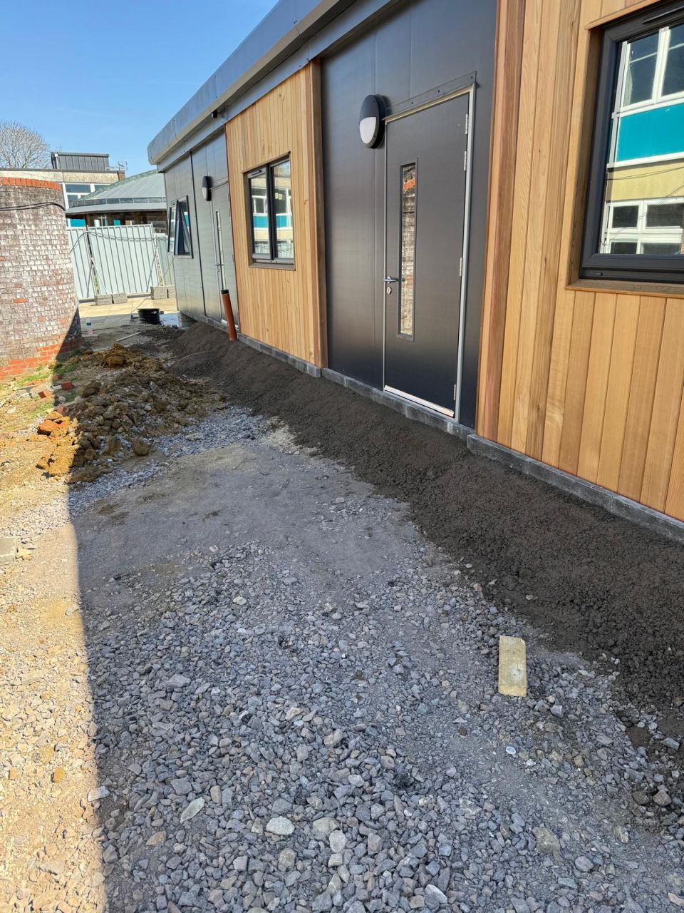 The project scope comprised the demolition of existing single-storey structures, installation of foundations and provision of below-ground service connections. Works also included the implementation of a stormwater attenuation system to manage surface water discharge and the construction of new hard landscaping and pedestrian pathways to integrate the new facilities within the existing school layout.